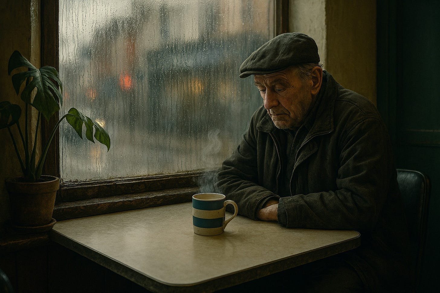 A mug of tea (blue and cream stripes, milk and two sugars) sat on the scarred Formica surface of Derek’s table. He always sought this table in the window, away from the door. On a different day it would be bright with sunlight, but not today.